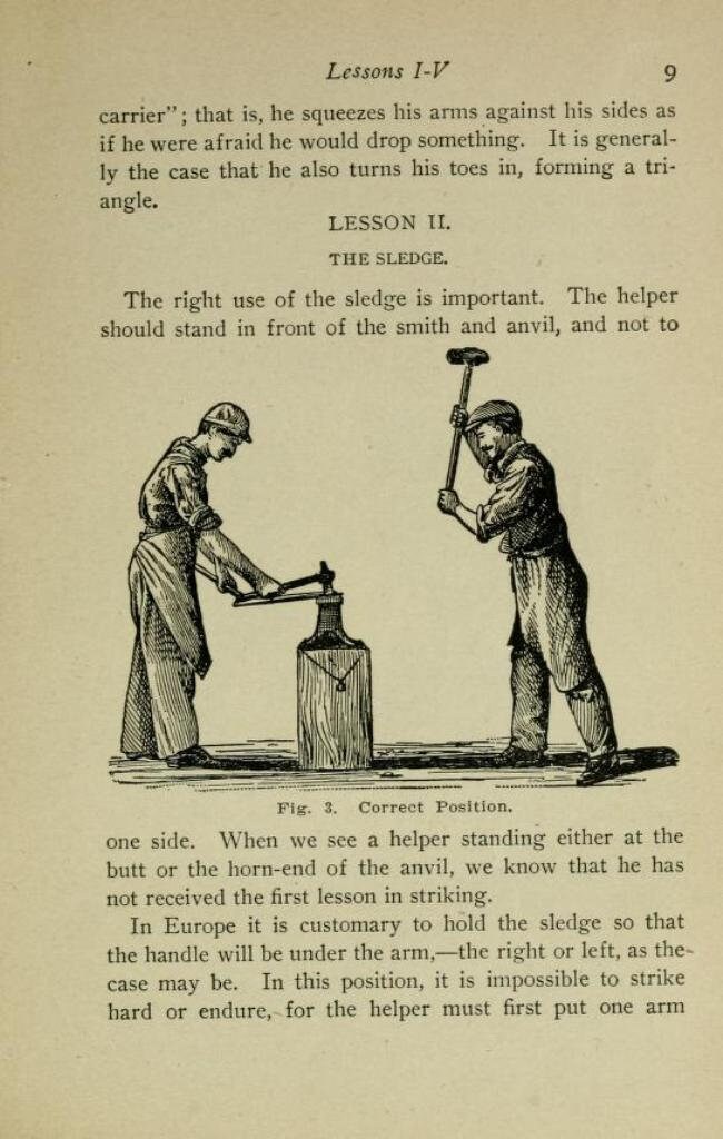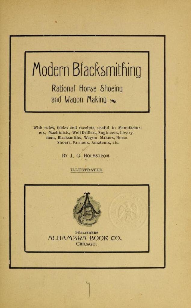 Standard blacksmithing, horseshoeing and wagon making containing twelve lessons in elementary blacksmithing by J. Holmstrom (1907)