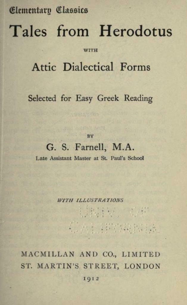 Tales from Herodotus with attic dialectical forms selected for easy Greek reading - G. Farnell (1912)