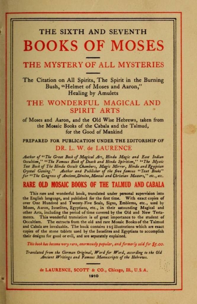 The sixth and seventh books of Moses ... the wonderful magical and spirit arts of Moses and Aaron - L. W. de Laurence (1910)