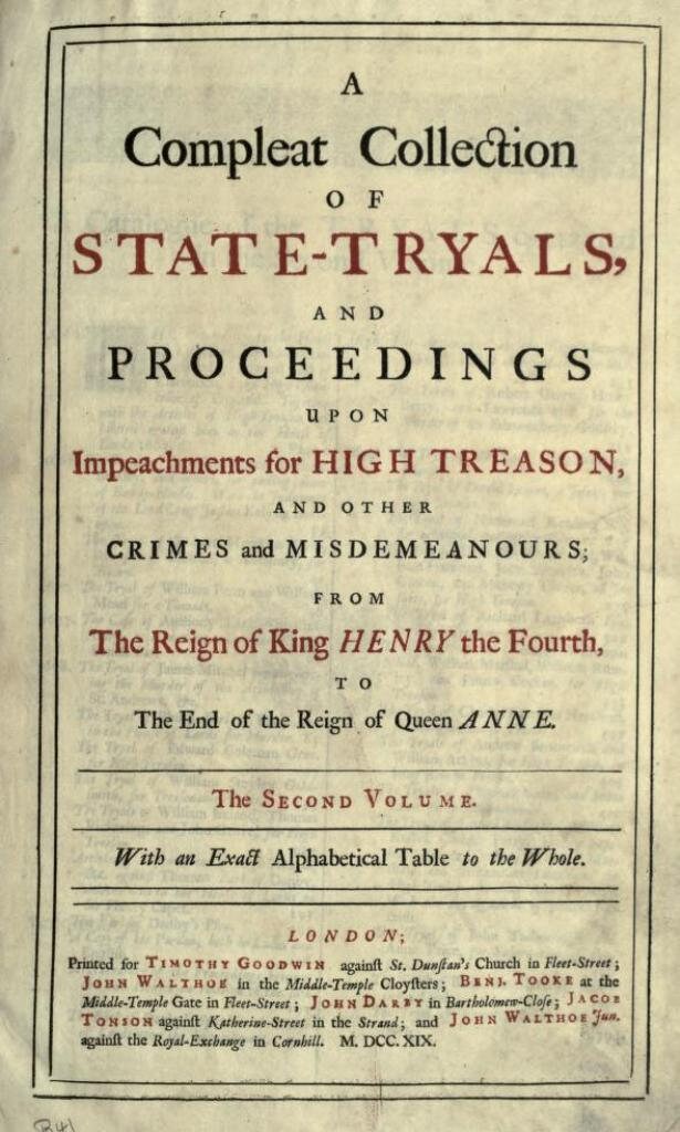 A compleat collection of state-tryals and proceedings upon impeachment for high treason and other crimes and misdemeanours Vols. 1 - 6 - T. Salmon (1719)