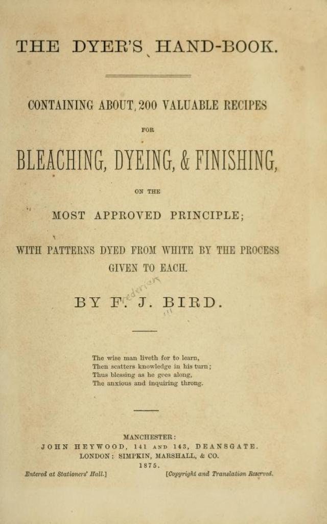 The dyer's hand-book - containing about 200 valuable recipes for bleaching, dyeing, & finishing - F. J. Bird (1875)