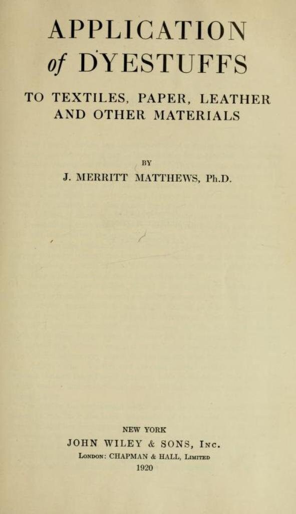Application of dyestuffs to textiles, paper, leather and other materials - J. M. Matthews (1920)