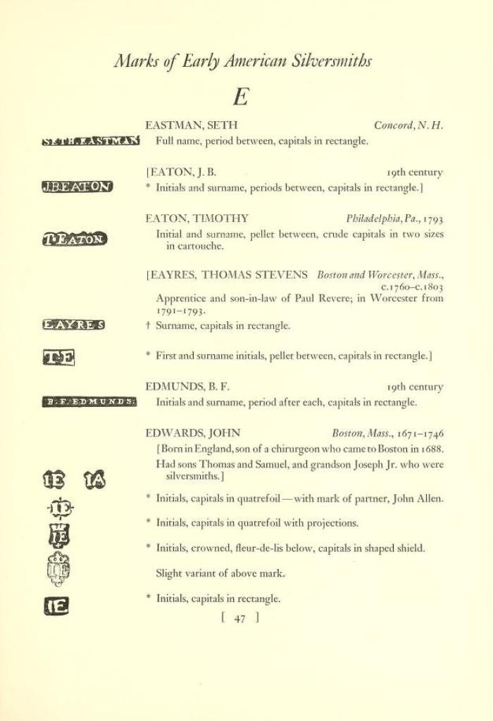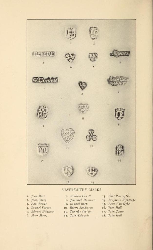 Marks of early American silversmiths, with notes on silver, spoon types & list of New York city silversmiths 1815-1841 - E. M. Currier (1919)