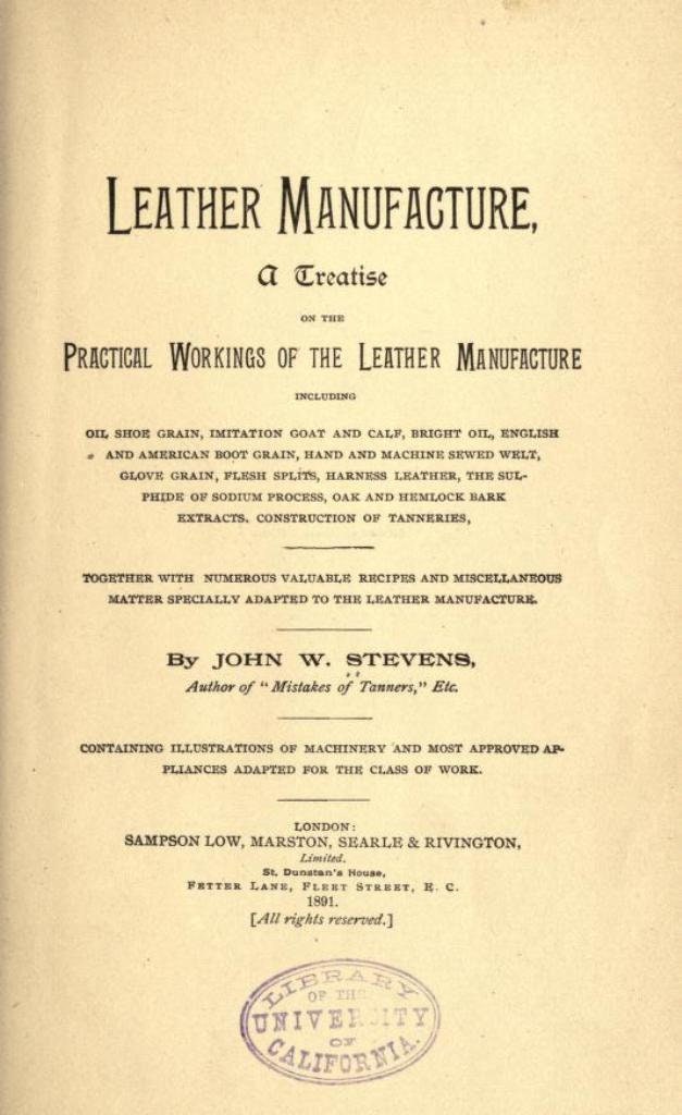 Leather manufacture, a treatise on the practical workings of the leather manufacture; ... together with numerous ... recipes... and miscellaneous matter by J. W. Stevens (1891)