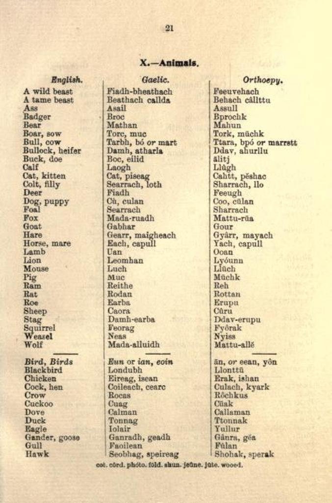 Gaelic names of beasts (Mammalia), birds, fishes, insects, reptiles, etc. in two parts 1. Gaelic-English.- 2. English-Gaelic - A. R. Forbes (1905)