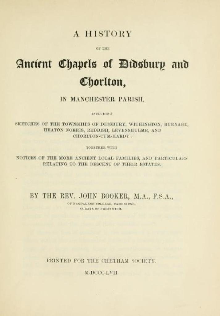 A history of the ancient chapels of Didsbury and Chorlton, in Manchester parish - J. Booker (1857)