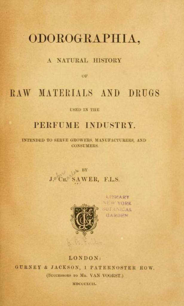 Odorographia - a natural history of raw materials and drugs used in the perfume industry intended to serve growers, manufacturers and consumers Vol. 1 by J. C. Sawer (1892)