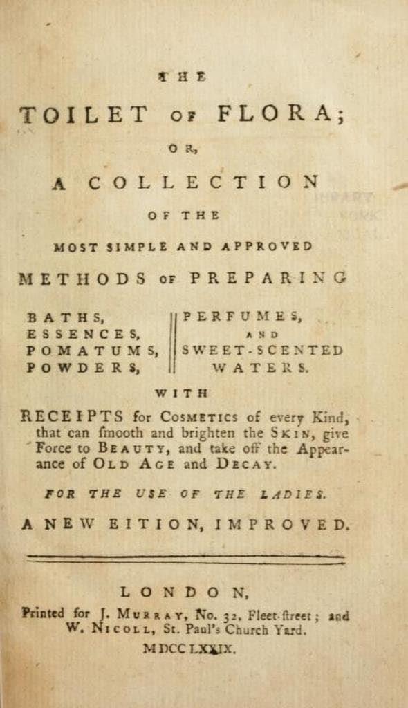 The toilet of Flora; or, A collection of the most simple and approved methods of preparing baths, essences, pomatums, powders, perfumes, and sweet-scented waters by P. J. Buc'hoz (1775)