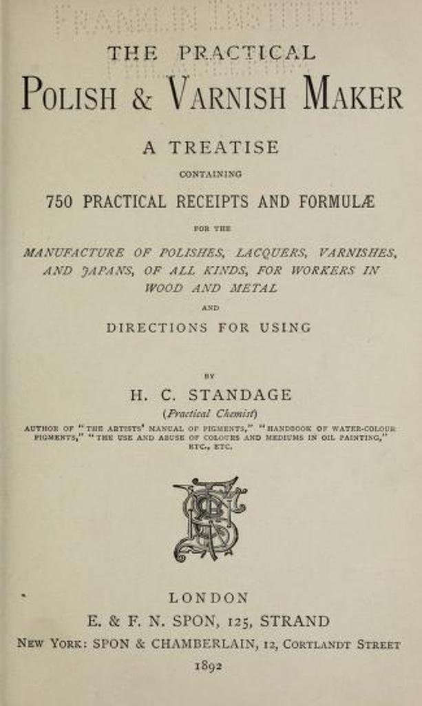 The practical polish & varnish maker, a treatise containing 750 practical receipts and formulae for .. polishes, lacquers, varnishes, and japans, of all kinds by H. Standage (1892)