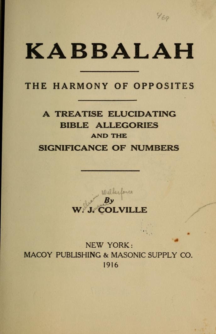 Kabbalah, the harmony of opposites - a treatise elucidating Bible allegories and the significance of numbers - W. Colville (1916)
